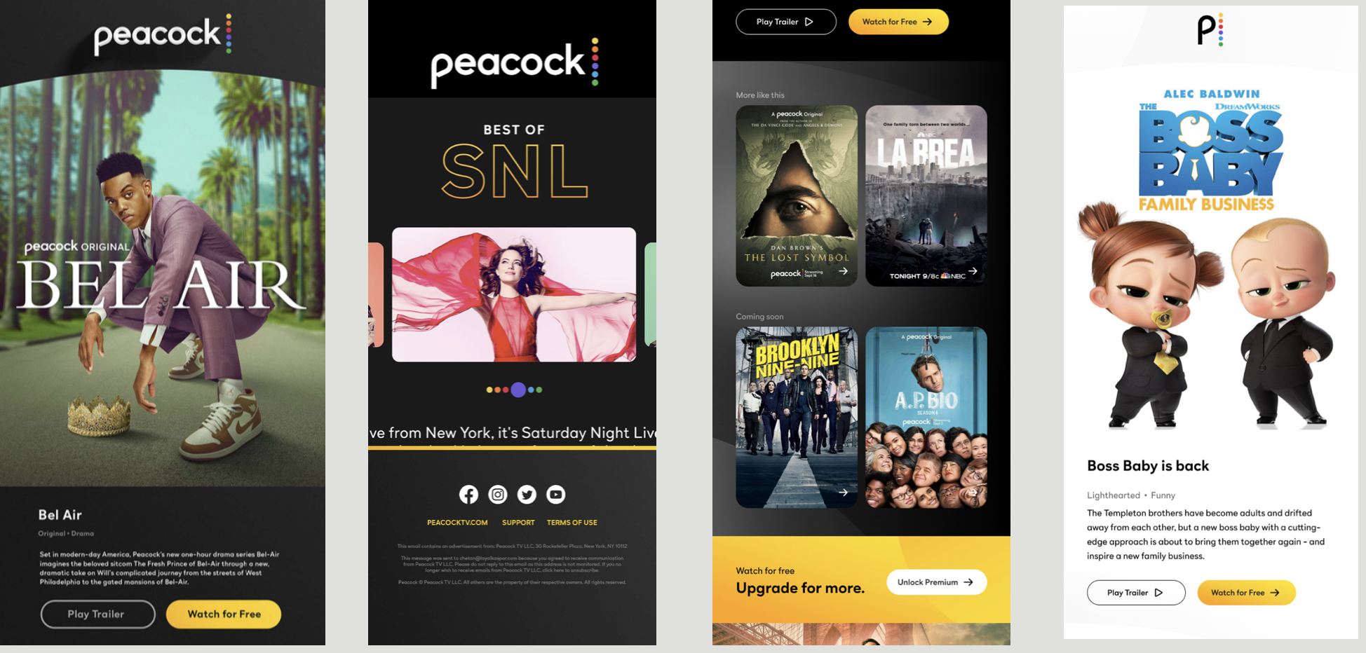 At the core of this endeavor was the opportunity to learn from all of our internal teams and NBCU partners by asking pressing questions; what aspects of the Peacock design had been working successfully over the past year, which elements had unearthed challenges that required new solutions, and which areas of the business had been underserved. We interviewed key stakeholders and identified several opportunities that would strengthen our brand image, using design solutions across various work streams. The result was a new brand-design-system that supported all parties, that impacted all of the designs on my team: Originals, Sports, Brand, Product, Social, CRM) which would optimize the ecosystem, while emphasizing the promise of an enhanced premium experience.